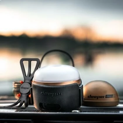 Deeper CHIRP+ 2 draadloze werpbare sonar met gratis cadeaus: multifunctionele Deeper Power Lantern en duurzame Deeper Smartphone Mount. Vind snel de ideale visstek, verlicht elk terrein of elke tent, laad je apparaten op en houd je telefoon veilig op alle hengels.