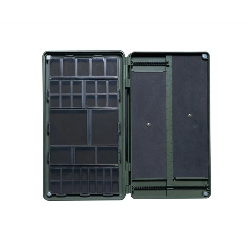 Dezelfde Armory Tackle Box die we allemaal kennen en waar we van houden, maar nu met een nieuw deksel dat de toevoeging van 38 kleine opbergvakken biedt. Perfect voor de opslag van wartels, rig-ringen, hookbeads, en nog veel meer. De nieuwe deksel van de Armory Pro heeft ook een liniaal aan de buitenkant voor het knopen van nauwkeurige rigs, elke keer weer. Elke visser houdt ervan om zo georganiseerd mogelijk te zijn als het gaat om hun kleinmateriaal, en de Armory Pro helpt je daarbij. Er zijn in totaal 67 opbergvakken van verschillende afmetingen die een breed scala aan items kunnen bevatten, zoals: scharen, haken, hooklinks, multitools en naalden, tot kleinere items, zoals hookbeads, wartels en rig-ringen. Alles heeft een thuis in de Armory Pro. De Armory Pro Tackle Box is weerbestendig en duurzaam dankzij de robuuste ABS-kunststof constructie. Met drie grote rigboards er aan toegevoegd, kun je er zeker van zijn dat je, ongeacht je stijl van vissen, op alles voorbereid bent.