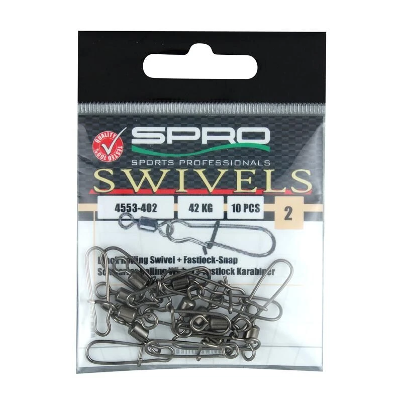 De rolling swivel met fastlock snap van Spro behoort tot de grote familie van een uitgebreid wartel assortiment. Spro heeft een groot aantal modellen, maten en trekkrachten. De Rolling Swivel met Fastlock Snap is bruikbaar in elke visserij en situatie. Deze is gebruiksvriendelijk als verbinding tussen hooflijn en onderlijn of hoofdlijn en kunstaas en vele andere situaties. Inhoud verpakking: 10stuks. Verkrijgbaar in de maten: