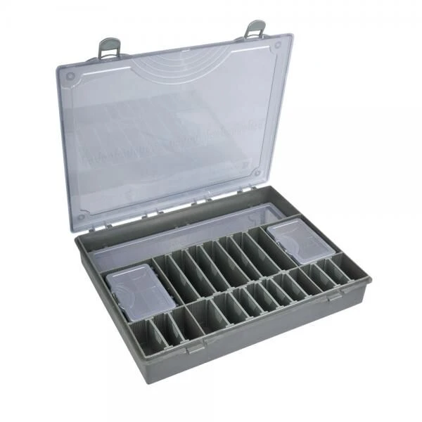 Uitgebreide tackle box voor het veilig en georganiseerd opruimen van allerhande rig accessoires. Voorzien van 5 extra tackle boxen; 1 x 2-compartimenten (6513-010), 1 x 3-compartimenten (6513-011), 2 x 4-compartimenten( 6513-012) en 1 x rig box. Super handig in gebruik tegen een zeer acceptabele prijs.